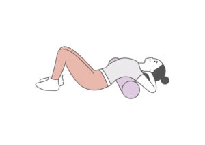 ストレッチポールもしくはバスタオル2枚をきつく巻いて棒状にして横向きに置きます。肩甲骨の下に当たるように仰向けに寝ます。腕をあげて胸をそらしていくと胸椎がほぐれていきます。